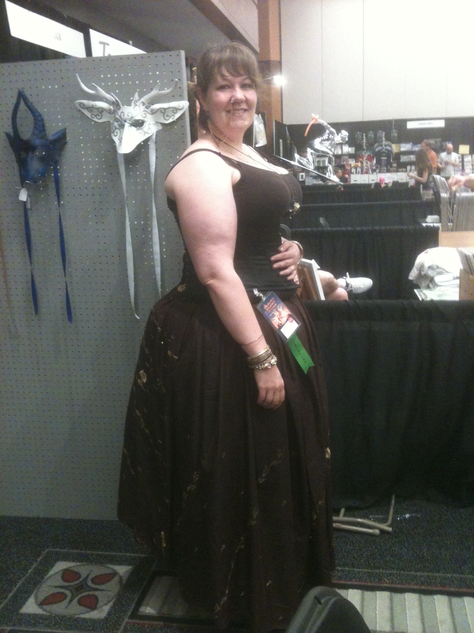 So, you may have noticed that there was no blog last weekend. Sorry about that. The play I was stage managing had its closing weekend and then I had to start getting ready for a sci-fi convention I was selling my jewelry at. The con was tons of fun. It was the Alabama Phoenix Festival’s first year and I think they did a great job. Here’s a picture of me in my costume from Sunday. I was going for kind of a steampunk sari sort of thing. The booth I’m in is the Silver Cicada Designs booth. You can see the totally awesome masks over my shoulder. The artist is awesome! I’ve got a Medusa mask from her that is out of this world! She also does really pretty hair slides. I got one with dogwood flowers.